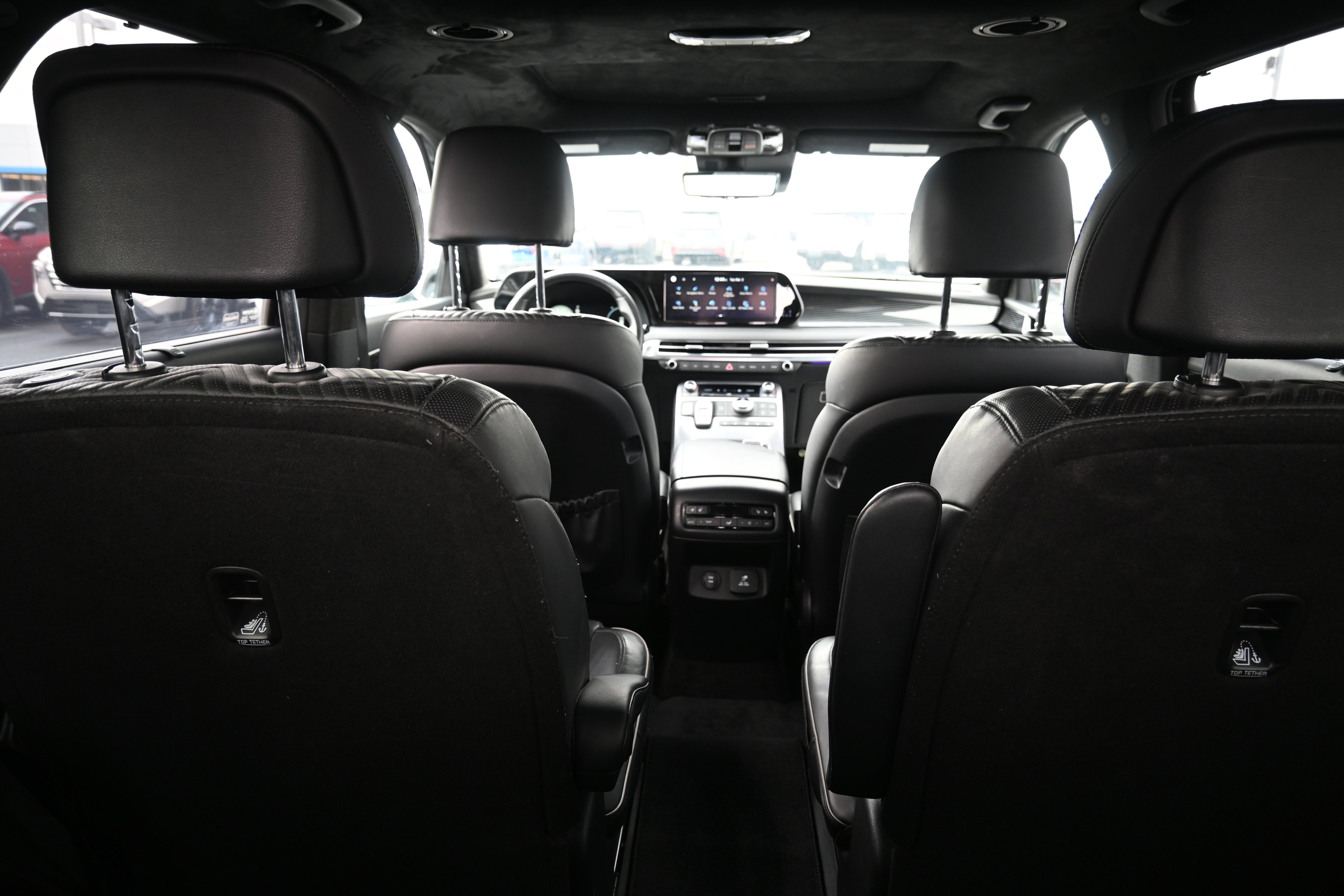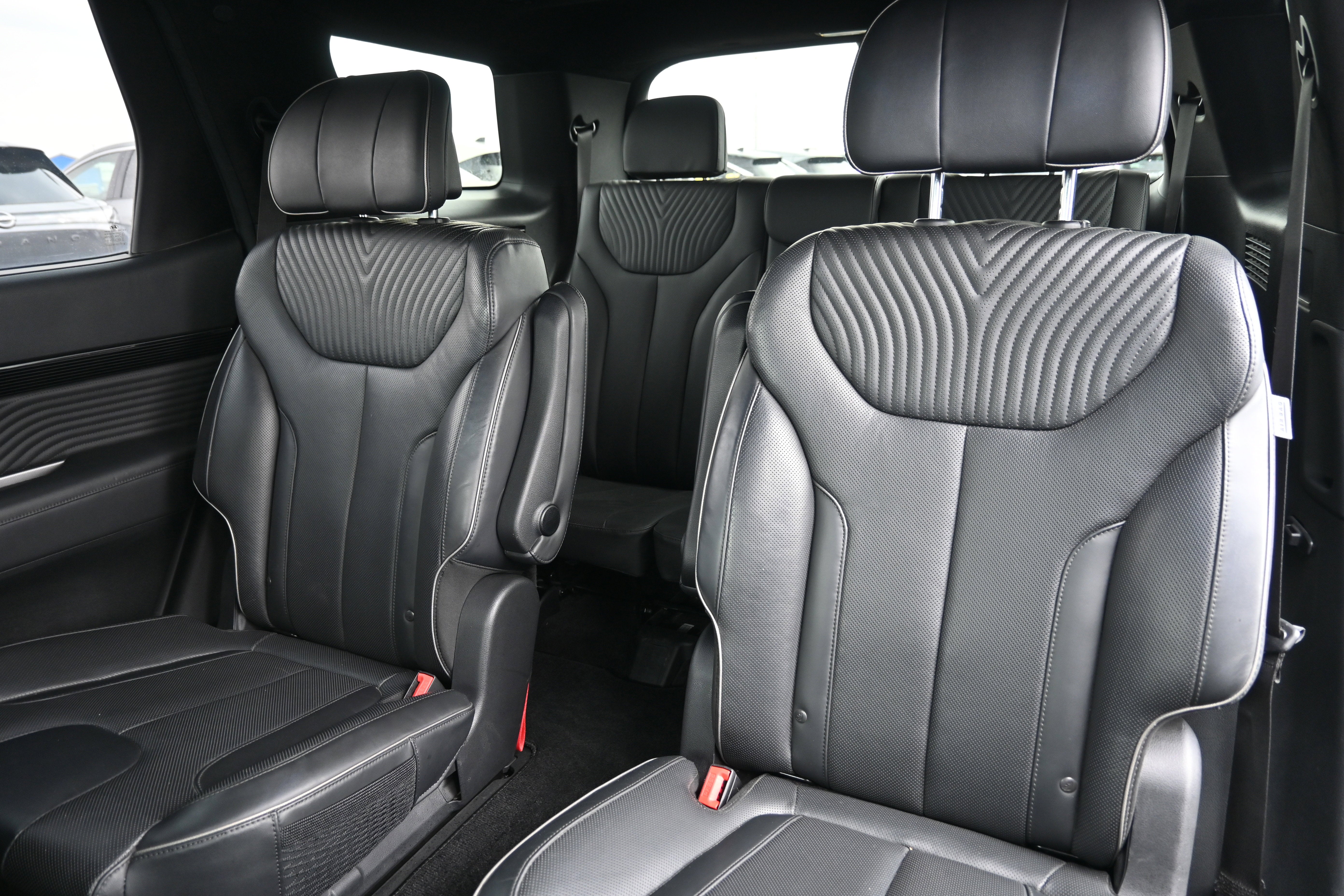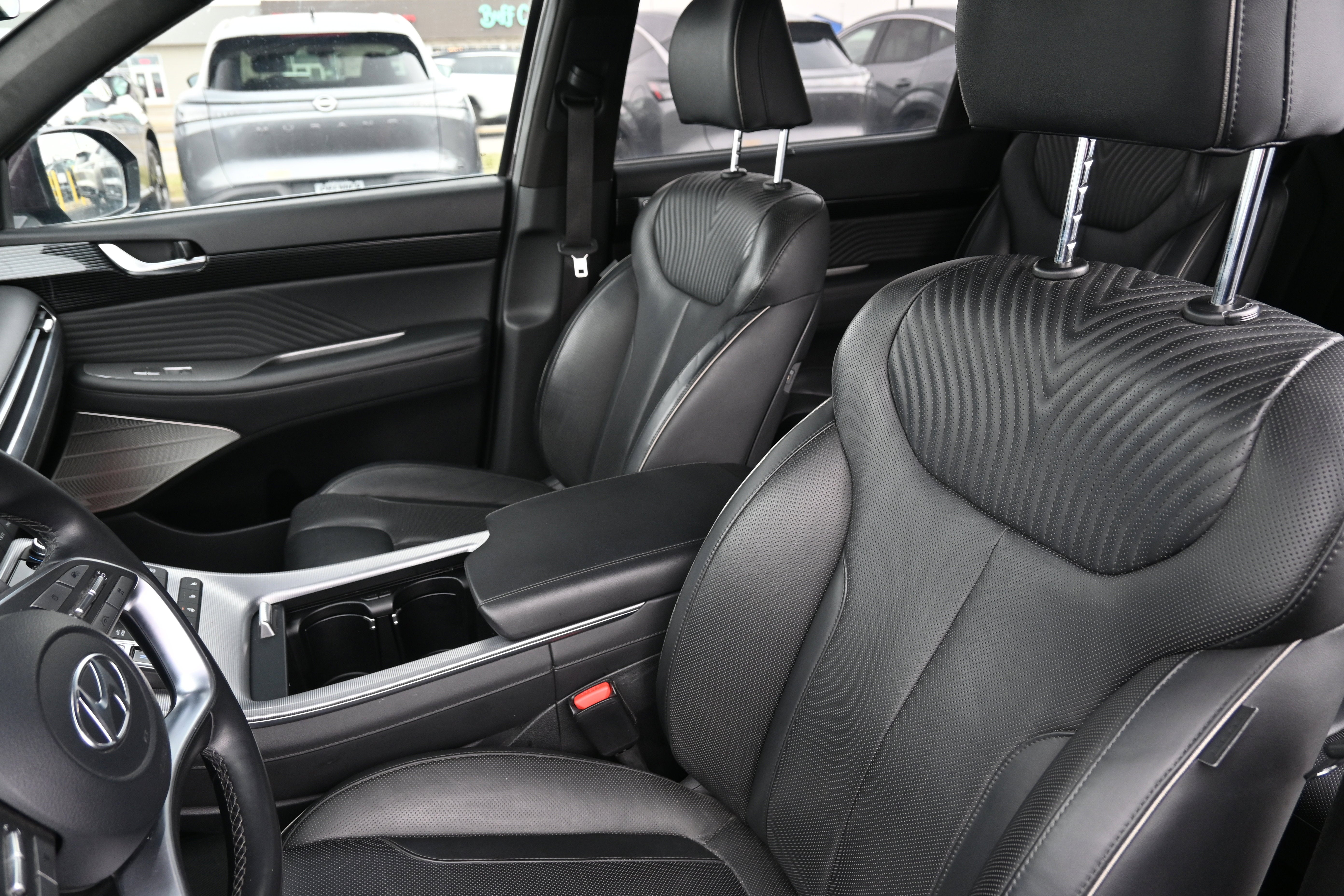 Cargo Package (Cargo Blocks, Cargo Net, and Cargo Tray), Option Group 01, 12 Speakers, 3.648 Axle Ratio, 3rd row seats: split-bench, 4-Wheel Disc Brakes, ABS brakes, Air Conditioning, Alloy wheels, AM/FM radio: SiriusXM, Apple CarPlay & Android Auto, Auto High-beam Headlights, Auto-dimming door mirrors, Auto-dimming Rear-View mirror, Auto-leveling suspension, Automatic temperature control, Brake assist, Bumpers: body-color, Carpeted Floor Mats, Compass, Delay-off headlights, Driver door bin, Driver vanity mirror, Dual front impact airbags, Dual front side impact airbags, Electronic Stability Control, Emergency communication system: Blue Link Connected Car Service (3-year complimentary subscription), Exterior Parking Camera Rear, First Aid Kit, Four wheel independent suspension, Front anti-roll bar, Front Bucket Seats, Front Center Armrest, Front dual zone A/C, Front reading lights, Fully automatic headlights, Garage door transmitter: HomeLink, harman/kardon® Speakers, Heads-Up Display, Heated & Ventilated Front Bucket Seats, Heated door mirrors, Heated front seats, Heated rear seats, Heated steering wheel, Illuminated entry, Knee airbag, Low tire pressure warning, Memory seat, Navigation System, Occupant sensing airbag, Outside temperature display, Overhead airbag, Overhead console, Panic alarm, Passenger door bin, Passenger vanity mirror, Power door mirrors, Power driver seat, Power Liftgate, Power moonroof, Power passenger seat, Power steering, Power windows, Premium Nappa Leather Seat Trim, Radio data system, Radio: AM/FM/MP3 Premium Audio System, Rain sensing wipers, Rear air conditioning, Rear anti-roll bar, Rear audio controls, Rear Bumper Applique, Rear reading lights, Rear side impact airbag, Rear window defroster, Rear window wiper, Reclining 3rd row seat, Remote keyless entry, Security system, Speed control, Speed-sensing steering, Splash Trim, Split folding rear seat, Spoiler, Steering wheel mounted audio controls, Tachometer, Telescoping steering wheel, Tilt steering wheel, Traction control, Trip computer, Turn signal indicator mirrors, Variably intermittent wipers, Ventilated front seats, Ventilated rear seats, Wheel Locks, and Wheels: 20" x 7.5J Calligraphy Exclusive Alloy.