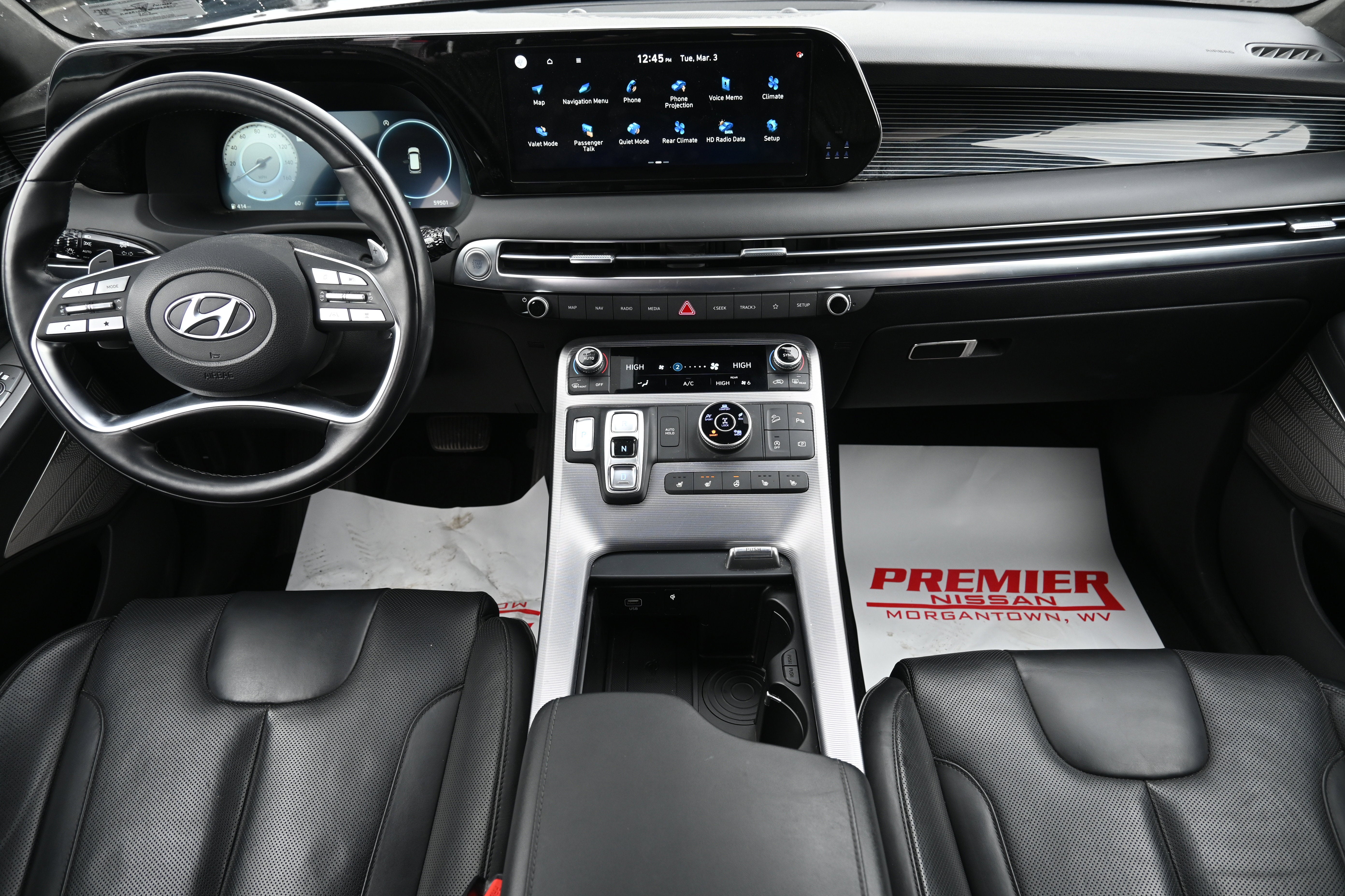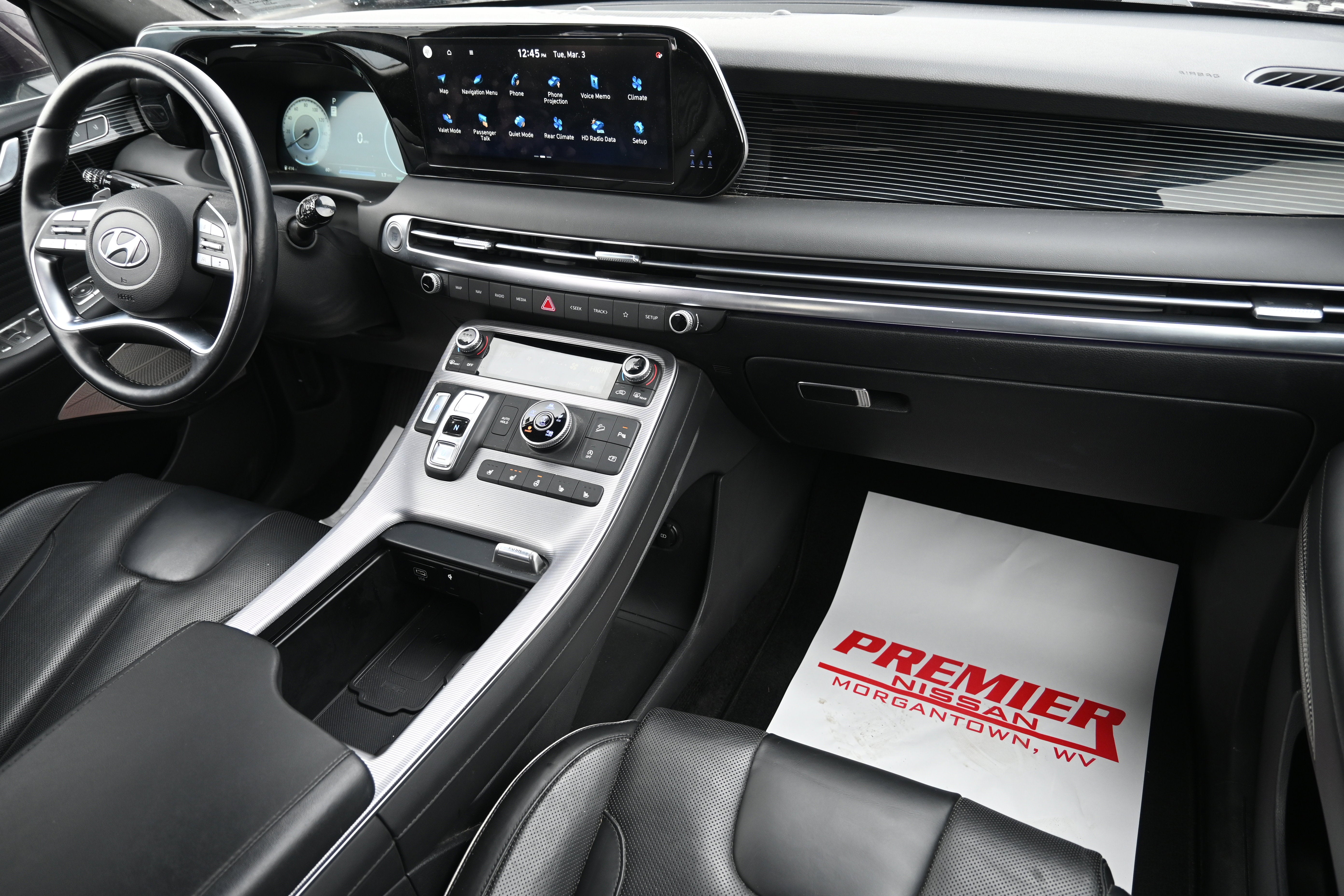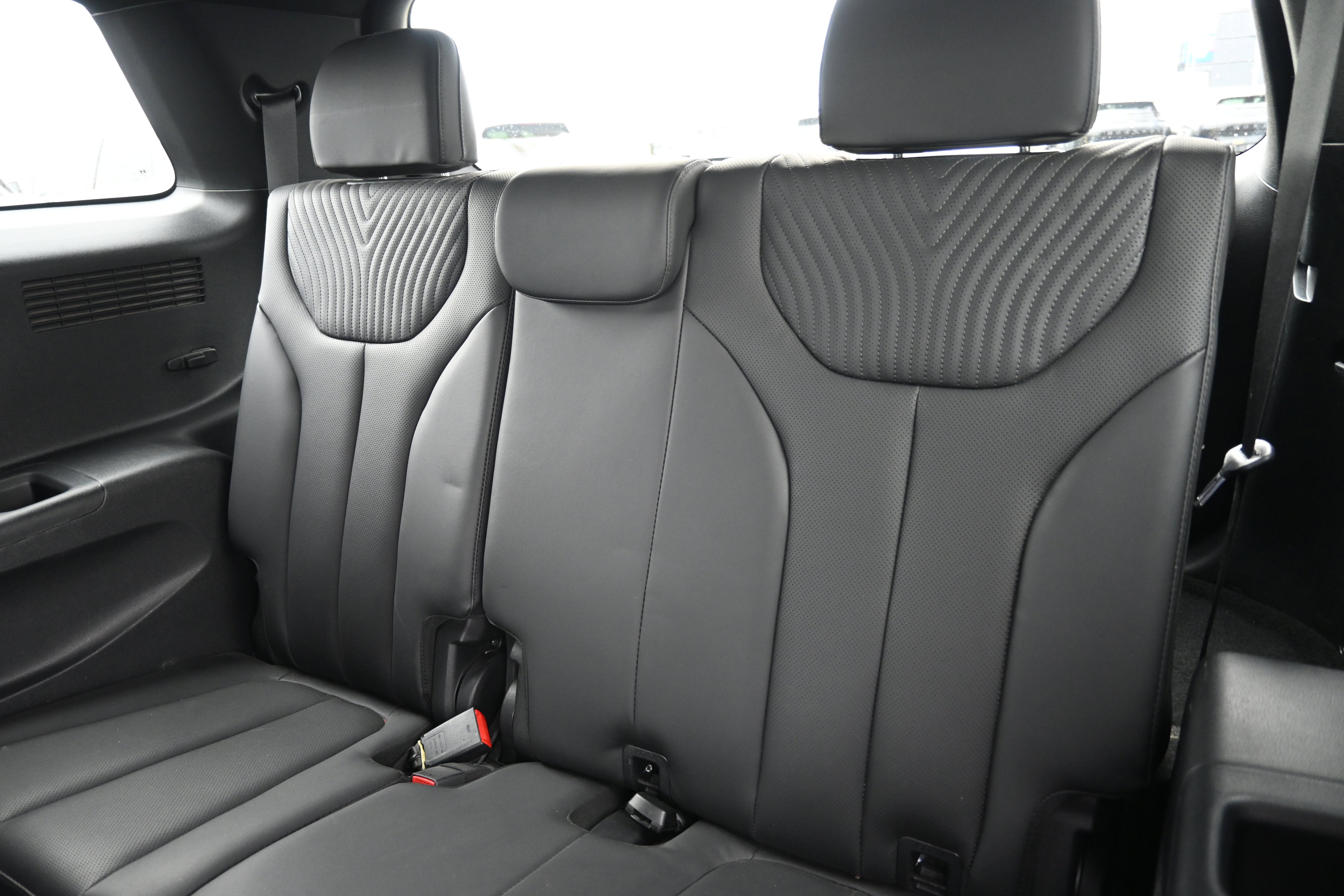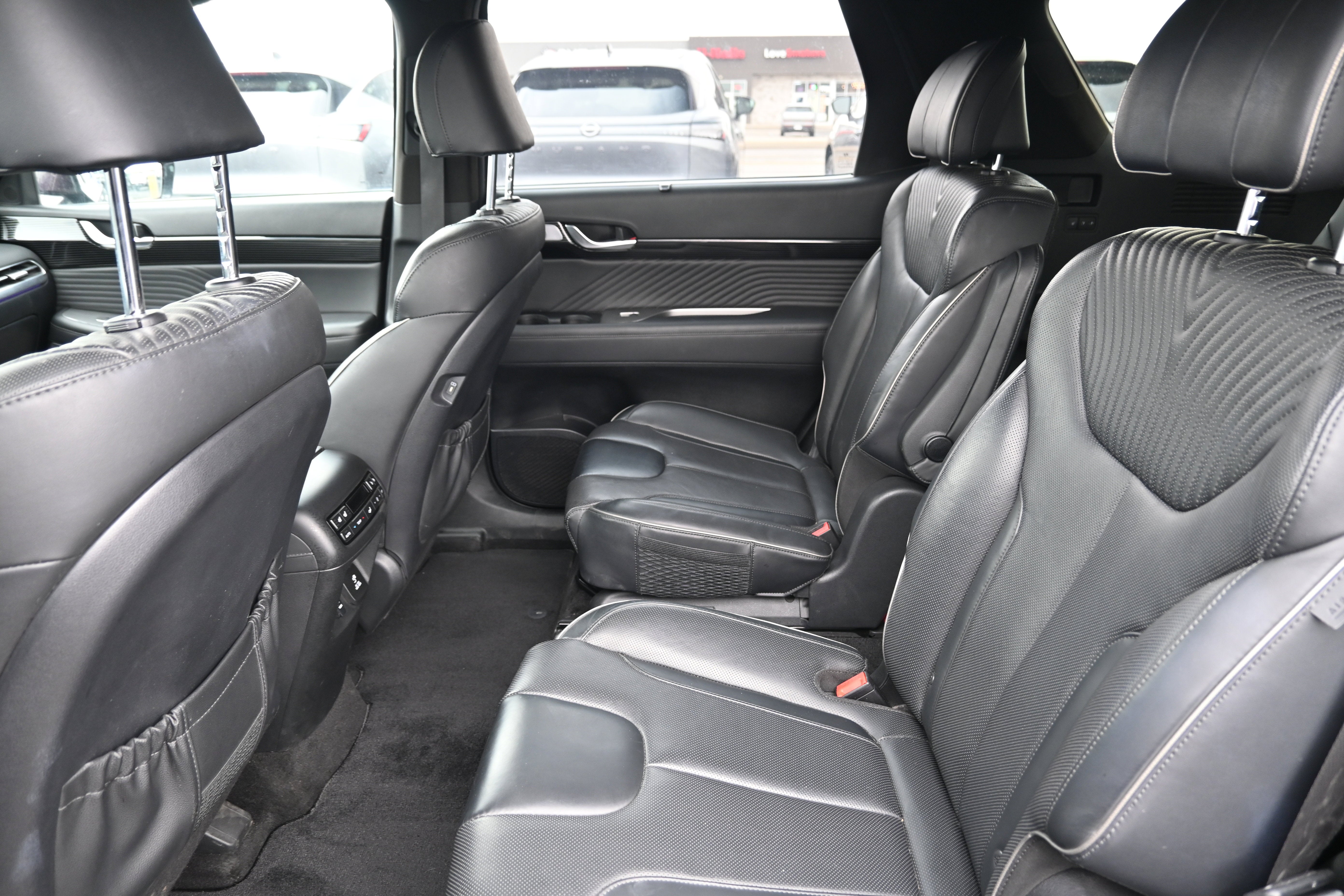 Cargo Package (Cargo Blocks, Cargo Net, and Cargo Tray), Option Group 01, 12 Speakers, 3.648 Axle Ratio, 3rd row seats: split-bench, 4-Wheel Disc Brakes, ABS brakes, Air Conditioning, Alloy wheels, AM/FM radio: SiriusXM, Apple CarPlay & Android Auto, Auto High-beam Headlights, Auto-dimming door mirrors, Auto-dimming Rear-View mirror, Auto-leveling suspension, Automatic temperature control, Brake assist, Bumpers: body-color, Carpeted Floor Mats, Compass, Delay-off headlights, Driver door bin, Driver vanity mirror, Dual front impact airbags, Dual front side impact airbags, Electronic Stability Control, Emergency communication system: Blue Link Connected Car Service (3-year complimentary subscription), Exterior Parking Camera Rear, First Aid Kit, Four wheel independent suspension, Front anti-roll bar, Front Bucket Seats, Front Center Armrest, Front dual zone A/C, Front reading lights, Fully automatic headlights, Garage door transmitter: HomeLink, harman/kardon® Speakers, Heads-Up Display, Heated & Ventilated Front Bucket Seats, Heated door mirrors, Heated front seats, Heated rear seats, Heated steering wheel, Illuminated entry, Knee airbag, Low tire pressure warning, Memory seat, Navigation System, Occupant sensing airbag, Outside temperature display, Overhead airbag, Overhead console, Panic alarm, Passenger door bin, Passenger vanity mirror, Power door mirrors, Power driver seat, Power Liftgate, Power moonroof, Power passenger seat, Power steering, Power windows, Premium Nappa Leather Seat Trim, Radio data system, Radio: AM/FM/MP3 Premium Audio System, Rain sensing wipers, Rear air conditioning, Rear anti-roll bar, Rear audio controls, Rear Bumper Applique, Rear reading lights, Rear side impact airbag, Rear window defroster, Rear window wiper, Reclining 3rd row seat, Remote keyless entry, Security system, Speed control, Speed-sensing steering, Splash Trim, Split folding rear seat, Spoiler, Steering wheel mounted audio controls, Tachometer, Telescoping steering wheel, Tilt steering wheel, Traction control, Trip computer, Turn signal indicator mirrors, Variably intermittent wipers, Ventilated front seats, Ventilated rear seats, Wheel Locks, and Wheels: 20" x 7.5J Calligraphy Exclusive Alloy.