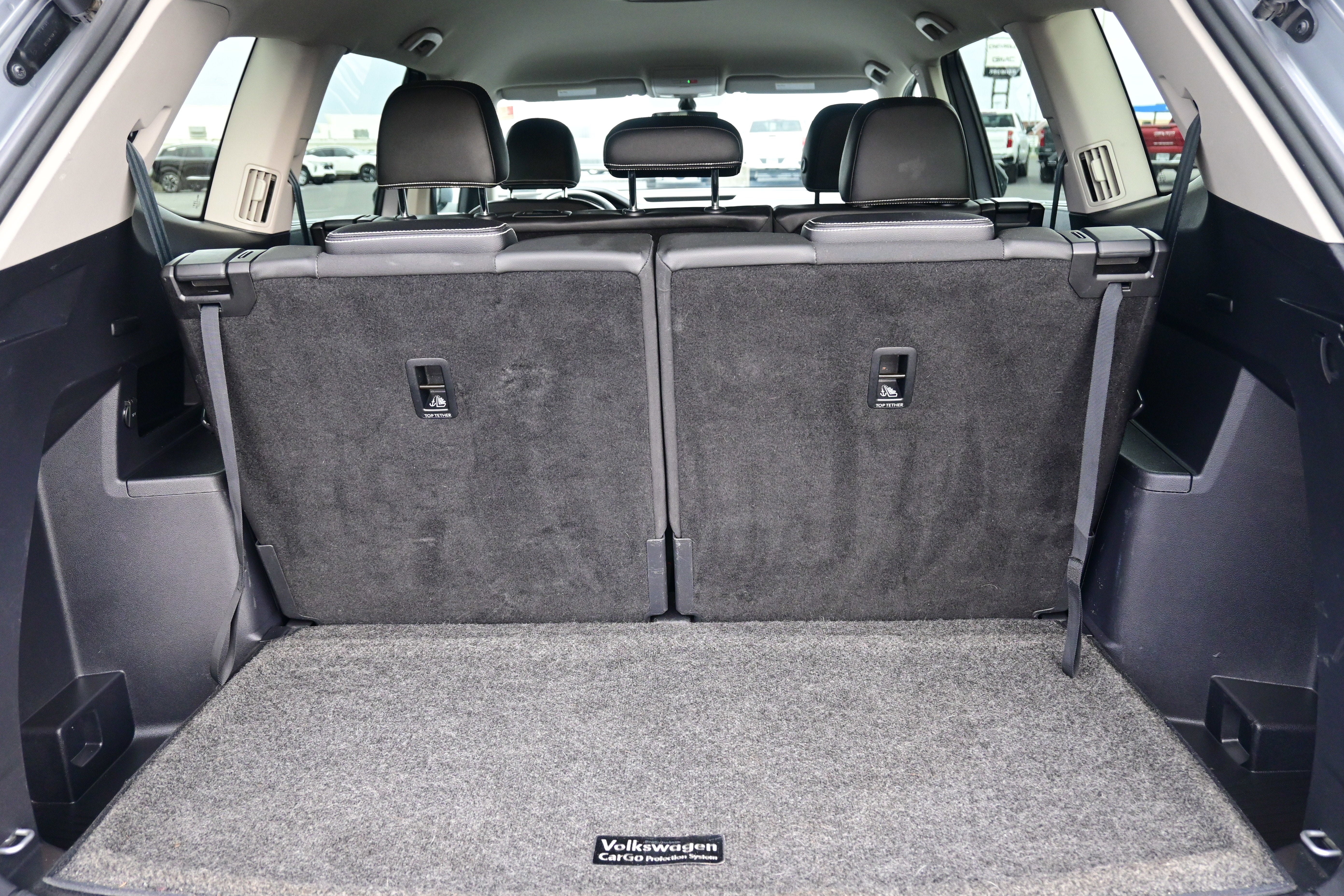 Black Wheel Package (Wheels: 20" x 8J 5-Spoke Black Painted Alloy), Trailer Hitch Extras, 3.60 Axle Ratio, 3rd row seats: split-bench, 4-Wheel Disc Brakes, 6 Speakers, ABS brakes, Air Conditioning, Alloy wheels, AM/FM radio: SiriusXM with 360L, Auto-dimming Rear-View mirror, Automatic temperature control, Brake assist, Bumpers: body-color, Compass, Delay-off headlights, Driver door bin, Driver vanity mirror, Dual front impact airbags, Dual front side impact airbags, Electronic Stability Control, Emergency communication system: VW Car-Net Safe & Secure 5-year, Exterior Parking Camera Rear, First Aid Kit, Four wheel independent suspension, Front anti-roll bar, Front Bucket Seats, Front Center Armrest, Front dual zone A/C, Front fog lights, Front reading lights, Fully automatic headlights, Heated Comfort Front Bucket Seats, Heated door mirrors, Heated front seats, Heavy Duty Trunk Liner w/VW CarGo Blocks, Illuminated entry, Leather Shift Knob, Low tire pressure warning, Occupant sensing airbag, Outside temperature display, Overhead airbag, Overhead console, Panic alarm, Passenger door bin, Passenger vanity mirror, Perforated V-Tex Leatherette Seating Surfaces, Power door mirrors, Power driver seat, Power Liftgate, Power steering, Power windows, Radio data system, Radio: MIB3 Composition Media w/8" Touchscreen, Rain sensing wipers, Rear air conditioning, Rear anti-roll bar, Rear reading lights, Rear seat center armrest, Rear window defroster, Rear window wiper, Remote keyless entry, Rubber Mats Kit - Bench Seats, Security system, Speed control, Speed-sensing steering, Split folding rear seat, Spoiler, Standard Suspension, Steering wheel mounted audio controls, Tachometer, Telescoping steering wheel, Tilt steering wheel, Traction control, Trip computer, Turn signal indicator mirrors, Variably intermittent wipers, VW Care, and Wheels: 20" x 8J 5-Spoke Silver Painted Alloy.